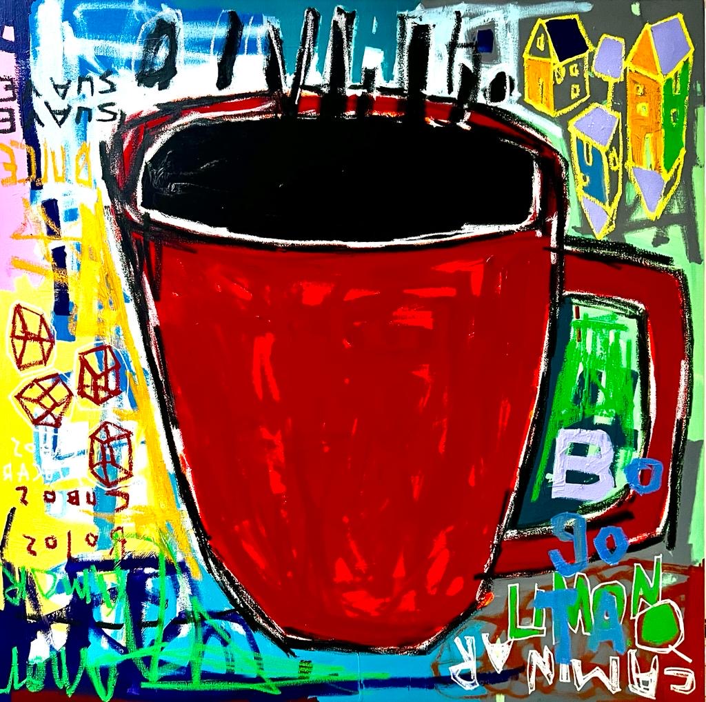 Cafeína Dimensiones 100x100cm Técnica Mixta sobre Lienzo Leonardo Pineda, es un artista colombiano que lleva pintando por 20 años. Sus obras son características llenas de color y siempre llevan un mensaje . Su temas , la cotidianidad , la ciudad, es muy cercano a las bicicletas, tema que le apasiona pues su hobby es precisamente montar en bicicleta. de esta serie del café , tenemos esta linda obra donde se aprecia su excelente manejo del color a la vez que como siempre le imprime su sello personal creando una obra única que persevera en el tiempo y llega para recrear espacios modernos.